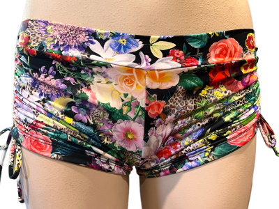 tie side short in botanical print on black background